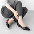 靴本体と異なる配色や異素材が施されたヒールがお洒落なポインテッドトゥフラットシューズ。インソールにもヒールと同じカラーや素材が用いられ、脱いでも可愛い一足に仕上がりました。
